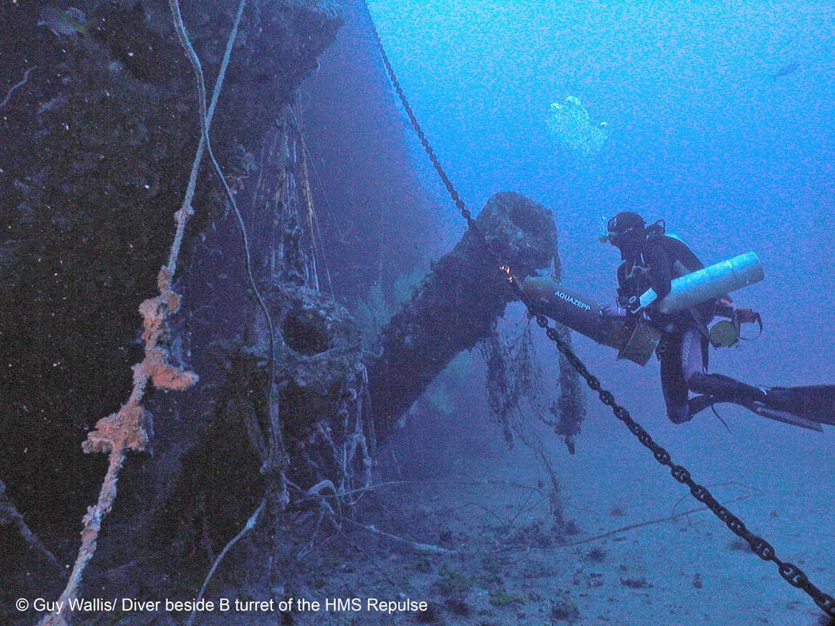 The tragedy of the loss in 1941 of two Royal Navy capital ships, HMS Prince of Wales and HMS Repulse, the core of Churchill’s deterrent Force Z, stunned the world. Churchill had hoped that sending a small powerful squadron of ships to Singapore would deter a threatened Japanese invasion of Malaya and Thailand. He was to be proved tragically wrong. Denuded of aircraft cover, Force Z was left disastrously exposed to air attack. Within eight days of their arrival at Singapore both ships were sunk with huge loss of life in a mass attack by 85 Japanese bombers. It was the Royal Navy’s greatest loss in a single engagement and the first time a modern battleship had been sunk by air power. The information here was taken from Asian Diver Issue 1/2013. Asian Diver magazine contains in-depth and up-to-date articles on various topics, covering the best diving destinations, the latest from leading conservationists and marine biologists, as well as fantastic compilations of underwater photography. You can check out the various themed issues at the shop. CLICK HERE.