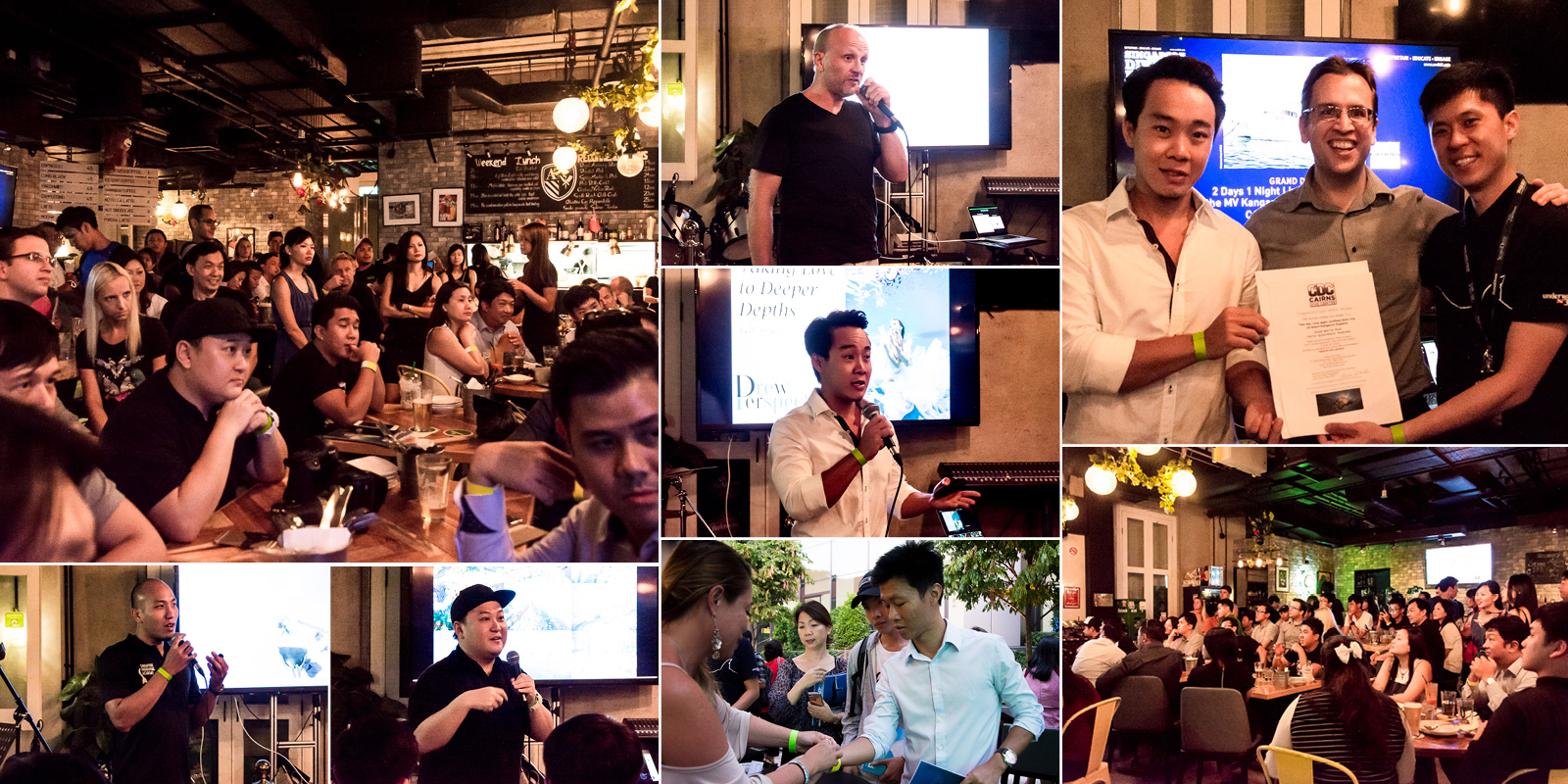 Picture the scene. It’s a full house – the bar is packed with a lively audience on the edge of their seats, patiently awaiting the news as to who has won the lucky draw. The number is called out, but no one answers. The number is called out again, alas, maybe the winner is on a smoke break… It’s too late for him or her, however. The crowd is happy though, there’s another chance to win. Another number is called, there’s a short silence, and then all of a sudden, a voice cries and a hand shoots up at the back. The crowd shares the enthusiasm, cheering and applauding the winner as he makes his way to the front to receive his prize. There’s a positive vibe amongst the audience, brought about by an evening of engaging talks, suspenseful (and pretty competitive!) lucky prize draws, and maybe the discount/ buy-one-get-one-free drinks that everyone’s enjoying. Held at the Armoury, a jazzy craft beer bar in the heart of Singapore, UW360’s bi-monthly Divers’ Party saw a hundred and fifty people gather for an evening of entertainment. From dive enthusiasts, to professionals, operators and even conservationists, there was a range of individuals who came along to enjoy the evening’s events, to catch up with others in the community, and to get their hands on some awesome prizes. Each registered guest received a great offer – 10% off all food, happy hour priced drinks and buy-one-get-one-free deals for Tiger and Fourpure beer, as well as the house pours. They also got a wrist tag with a number, and some of the lucky ones had those digits called out… Those who registered also received complimentary copies of Scuba Diver Oceanplanet 2017 and Asian Diver’s Diveaholic 2017. The evening kicked off with an introduction about the UW360 group – the award-winning titles we publish, Asian Diver and Scuba Diver – followed by a brief about the four speakers delivering presentations: Jonathan Chong, Glenn Yong, Jeroen Van de Waal and Andrew Lim. Jonathan Chong, a freediving champion and founder of the Apnea Association of Singapore, communicated his passion for the sport to the audience. He also talked about his philosophical view of freediving as a tool for understanding oneself and overcoming inner barriers. He tried to levy some new recruits from the crowd, within which there were quite a few adventurous types who expressed interest… Jonathan was kind enough to present four vouches for free freediving tryouts to members of the audience. Next, we had Glenn Yong, recently accredited as a Master Photographer in the United Kingdom. Glenn stunned the audience with his superb images of stunning details and colours, primarily those he took on assignments in the past year. His video footage took people aback as well, with many gasps heard from within the crowd and various individuals thinking out loud as to their ideas about what equipment he was using. Glenn answered all their queries in the Q&A, and also shared a few quips which got people laughing! Jeroen’s presentation took the audience on a story of his life: Falling in love with the oceans despite growing up far away from them in the east of the Netherlands: Getting caught up in the corporate rat race: And finally committing to his ocean-conservation dream, setting up OrcaScuba. He finished by expounding an important message about conservation, and how it is up to us as individuals to bring about that change rather than waiting on governments. Lastly, we had Andrew Lim – an underwater photographer who published his first book at 21 and met the President of Singapore, Dr Tony Tan, in recognition for his achievements. He spoke about his work with Drewperspectives, a Singaporean-based underwater photography firm, as well as his spectacular photos. The underwater photos of models intrigued the audience, and Andrew espoused about the details of taking such shots – not to mention the challenge of holding one’s breath while doing so. He was happy to report that he can now hold his breath for four minutes compared to one minute when he first began! Following from their presentations, the speakers stayed on stage for the lucky draw, picking out the tickets and announcing the winners. There were four categories for the lucky draw, which each taking place after each presentation. The Grand Draw – as the name would suggest – was the most sought after. Here were the prizes offered in the Grand Draw: