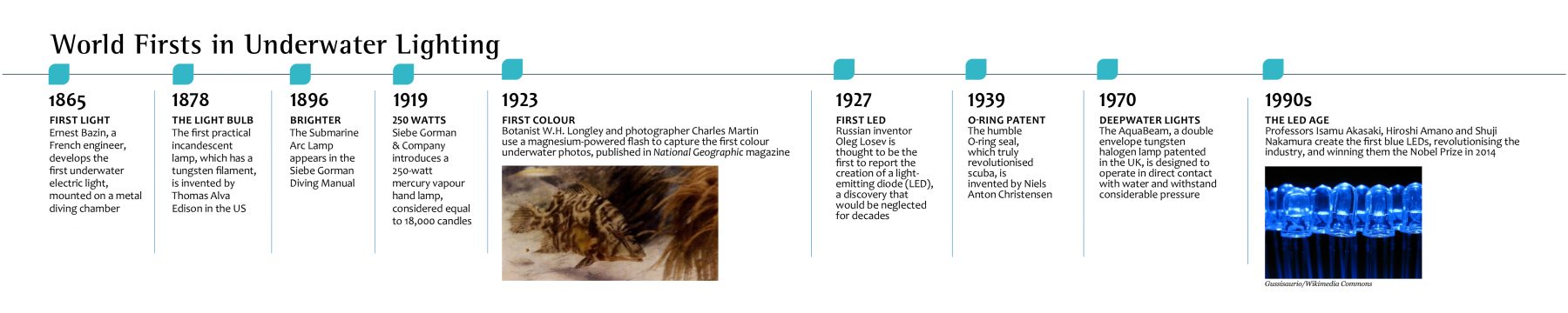 In 1893, the same year the world’s first underwater camera was built, Louis Boutan began to experiment with underwater lighting systems. He had little choice as photographs back then required more light than was naturally available underwater. Like many first-time experiments, he was left disappointed. Until this point, flash photography required oxygen and typically burning magnesium or a mixture thereof. Boutan recruited electrical engineer M. Chaffour to create a bulb that would serve as a housing for a magnesium ribbon. The reservoir was then filled with oxygen and the ribbon was lit using electricity. Unfortunately, the magnesium smoke coated the inside of the bulb and dimmed the lighting, not to mention the danger involved, as the bulbs frequently exploded! We have come along way since those days, with an array of strobes, video lights, torches, and headlamps, to illuminate any subaquatic pursuit.