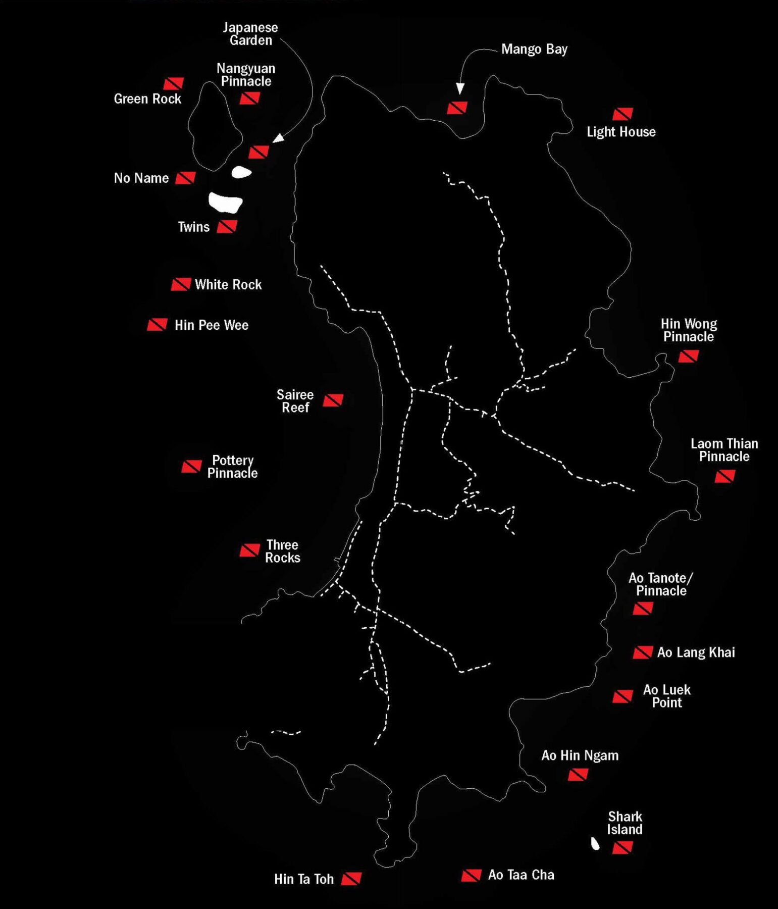 The Similan Islands National Park is 90 kilometres (56 miles) northwest of Phuket and includes the nine islands of the Similan group [from north to south: Ba-ngu (No. 9), Similan (the largest, No. 8), Payu (No. 7), Miang Sam or Hin Pusar (No. 6), Miang Song (No. 5), Miang (No. 4), Payan (No. 3), Payang (No. 2), and Huyong (No. 1)] and two nearby islands, Koh Bon and Koh Tachai. Most dive operators refer to the Similan (the Malay word for “nine”) Islands by a number, rather than a name, but they do not necessarily agree on which number goes with which island! You are also very likely to see a variety of spellings for the same island. The key is to enjoy the diving regardless of the location’s fluctuating designation.