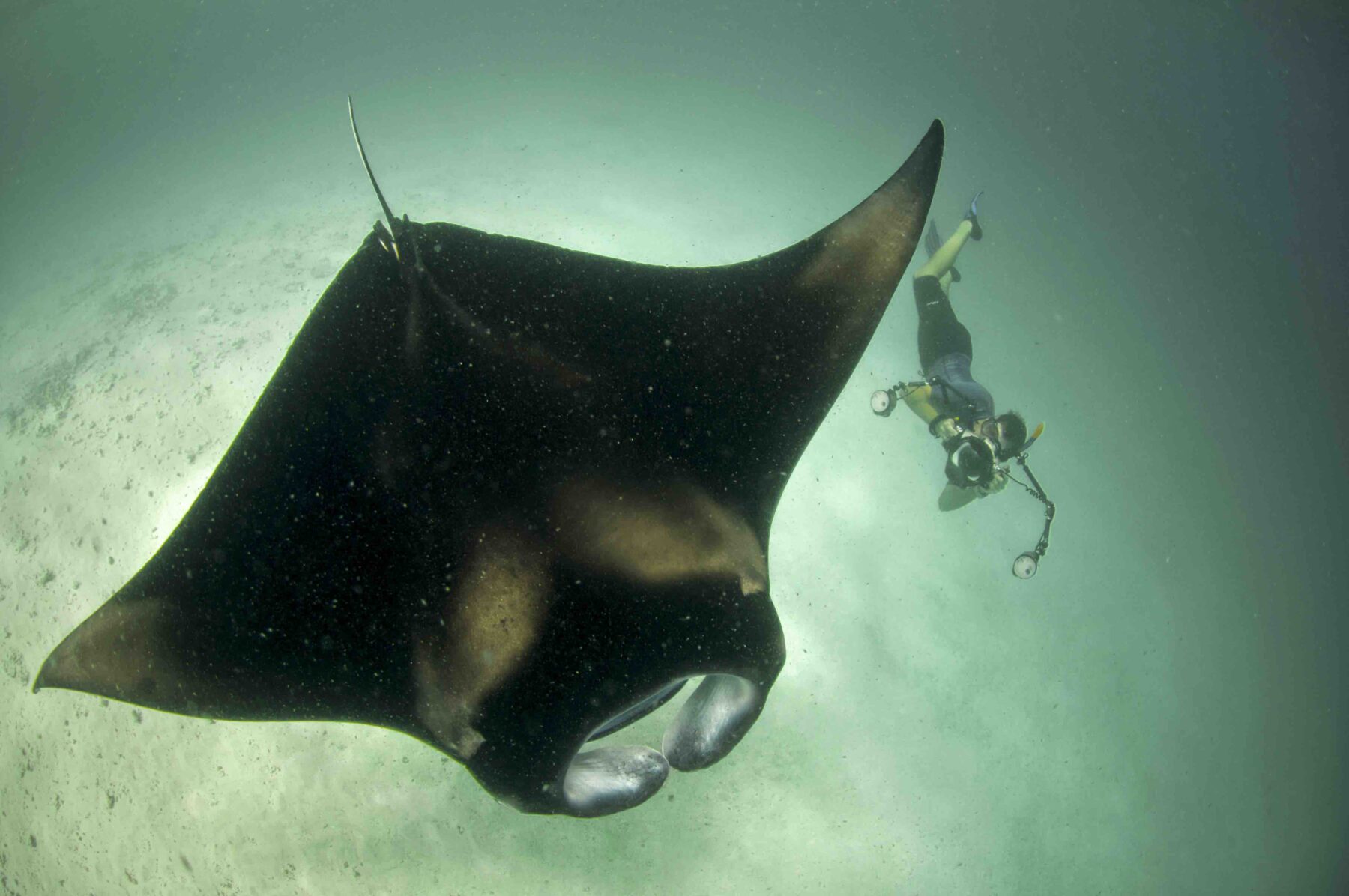 I usually jump in an hour after sunset, descend to the sandy bottom, kneel down and wait for the mantas to show up. I don’t have to wait long. They come in fast! With their mouths wide open and swooping in through the plankton ball, they always perform an awesome show every night, boasting their acrobatic skills. I have lingered beneath, mesmerised by them, often for more than an hour.