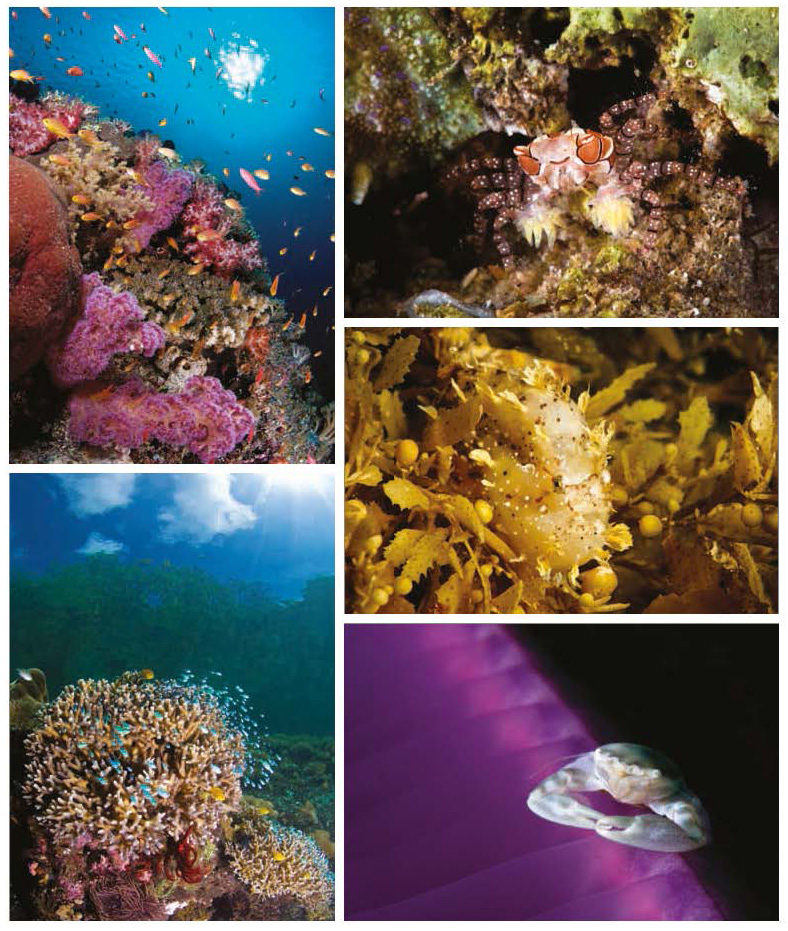 Richelieu Rock (Hin Plo Naam in Thai, which means “rock protruding from the water”) is an isolated seamount with a series of pinnacles that appear to form the upper half of a padded armchair. The tall central pinnacle barely clears the surface at low tide. Currents continually bathe the reef with nutrients and serve as conduits that carry pelagics, such as manta rays and the occasional whale shark, and free-floating larvae to the seamount. Richelieu Rock’s remote location limits the number of visitors and the impact of human-related contamination.