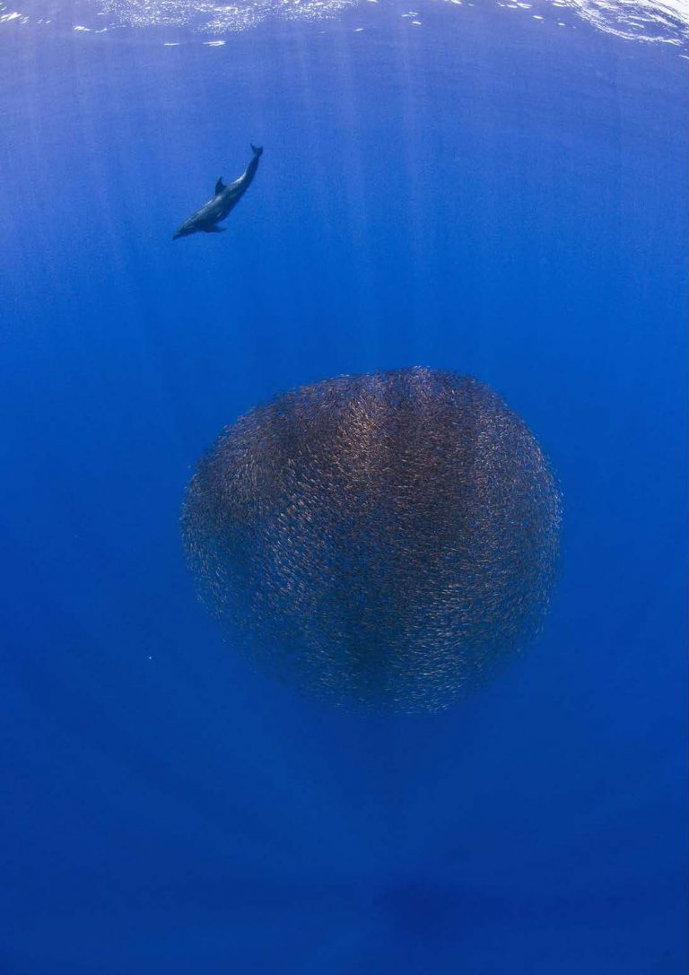 There are several pelagic predators chasing the dense schools of blue and yellow baitfish. I know I am in the right location to potentially see a nice fish. My hunting technique is to be relaxed, scan the depths and occasionally dive to midwater (about 10 metres), then hold my position and breath and wait for a curious pelagic fish to investigate me. It may take 10 minutes or three hours of waiting for the desired fish to be in my vicinity. I am startled to see a school of three medium-sized mackerel.