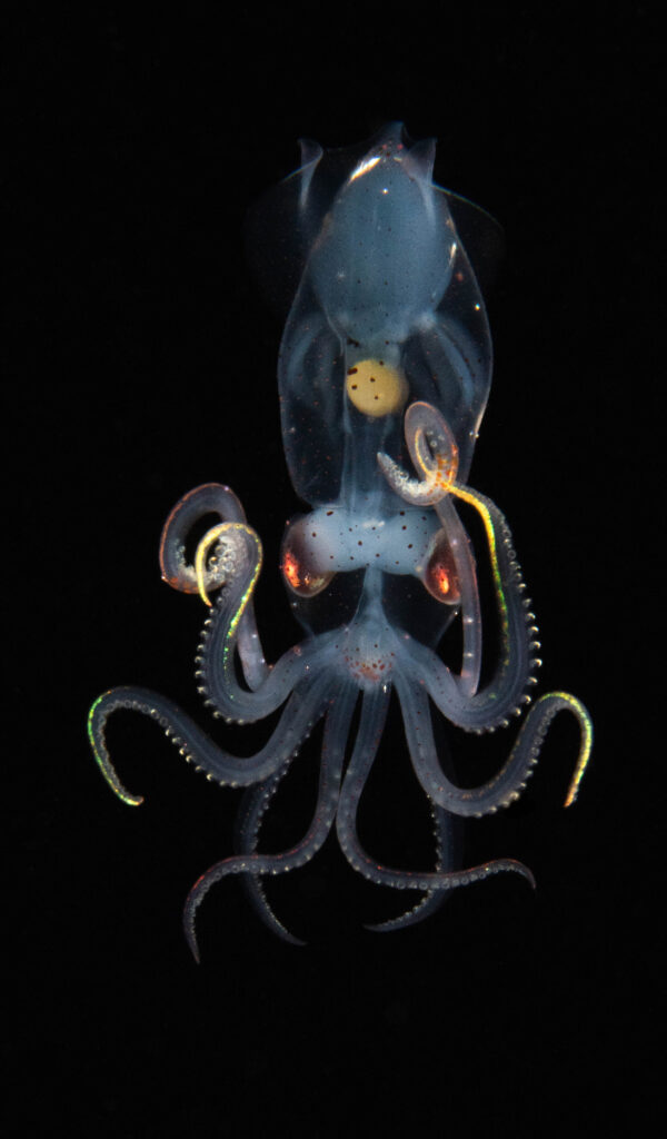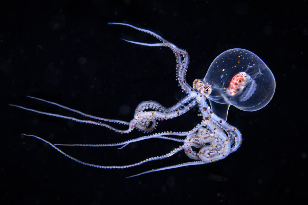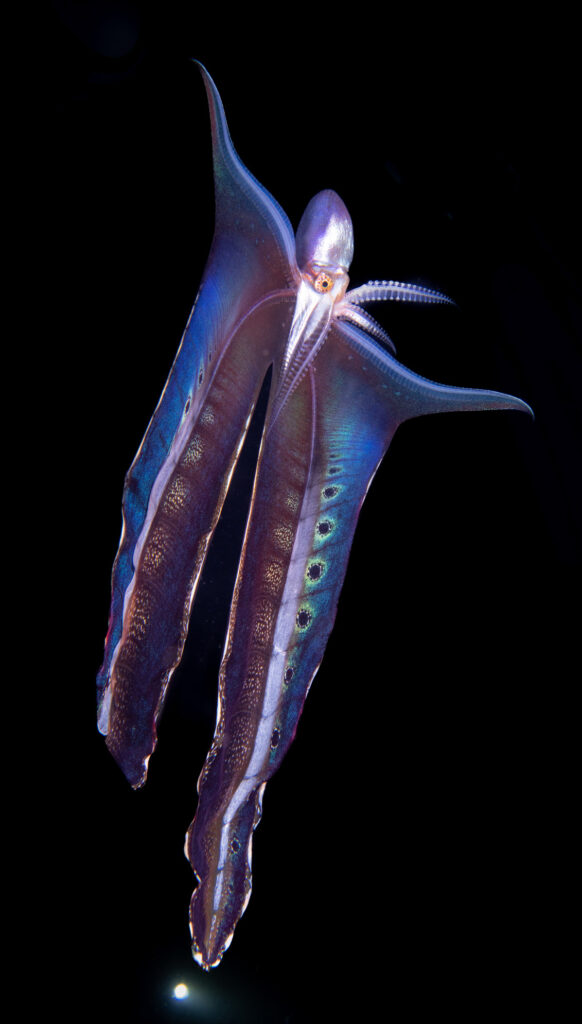 In this next-level type of night diving, the ocean serves up the kind of life you’ll only find in sci-fi movies. Attracted to floodlights suspended in midwater, creatures emerge from the depths to feed. This is the largest animal migration on Earth, and it happens every night! The macro life includes crabs, squid, fish larvae, and the larvae of other alien creatures. They are usually transparent or bioluminescent, although there are some exceptions like the shimmering blanket octopus (Tremoctopus violaceus).