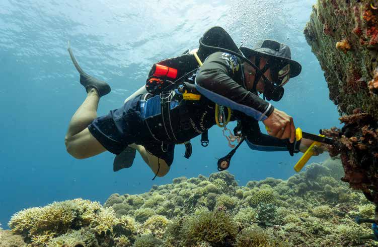 One of the main responsibilities of the marine park rangers is law enforcement. They watch out for any illegal activities and apprehend fishers and poachers if needed. But they are more than law enforcers. They are researchers who collect data on fish, corals, and birds. They are mechanics and construction workers who must do boat and home repairs, and install and maintain mooring buoys. They collect garbage, picking up marine debris underwater and on the surface, and they are also salespeople and cashiers, selling T-shirts and other merchandise to divers who have the chance to visit the ranger station.