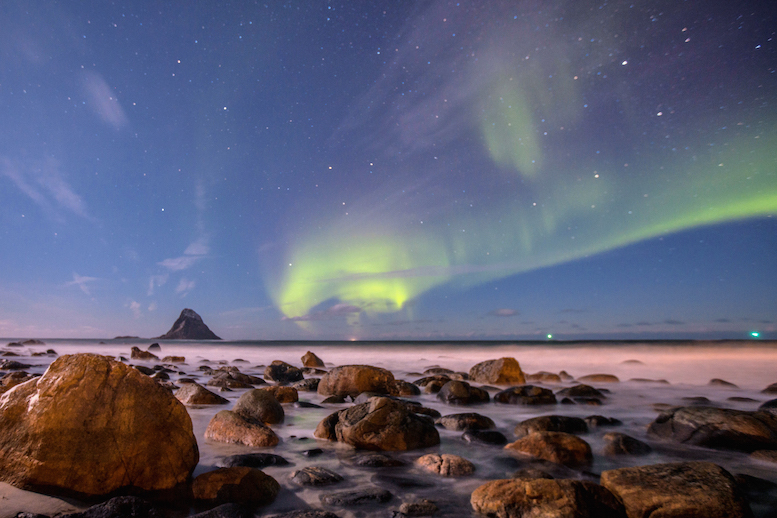 Northern Lights or Polar Lights also known as Aurora over a beach with some stones lightened up from streetslights, Bleik, near Andenes, Andoya, Northern Norway, Atlantic Ocean, Arctic. © Tobias Friedrich