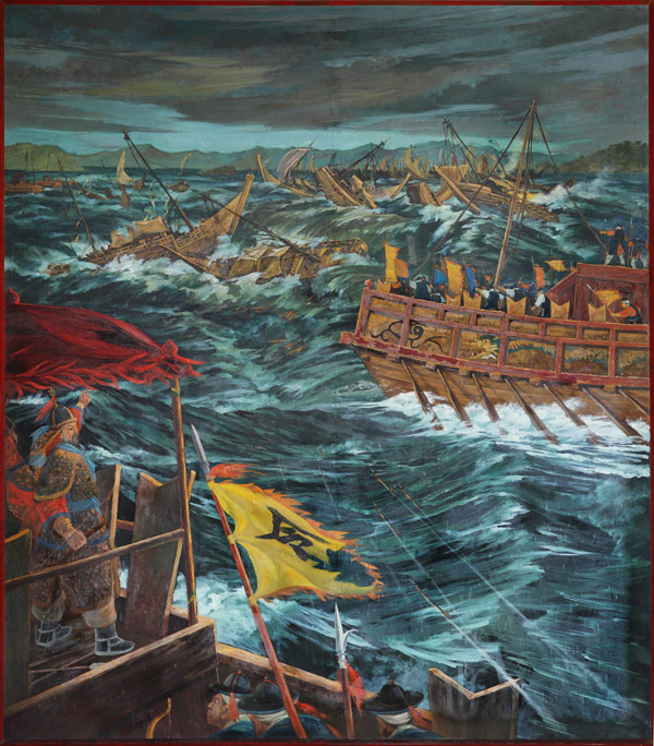 Admiral Yi studied numerous sites for his last stand against the Japanese navy and decided on luring them into the Myeongnyang Strait. It was obvious that the Japanese would enter the strait when the tide was favourable, so he didn’t want to fight south of the strait, with the current at the attacker’s advantage. Instead, he fought in the waters just north of the strait, where the currents were calmer. The strait had very strong currents that flowed at approximately 10 knots, first in one direction, then in the opposite direction, at three-hour intervals.