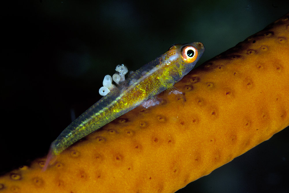 Almost every animal group can be parasitic, and at the same time can be parasitized. While worms are the kings of endoparasites, a large number of marine ectoparasites are crustaceans. A quite common example is the Pennellid copepod, which often infects the Loki’s whip goby, or other small fishes. This family of crustaceans (Pennillidae) contains a large number of species, which can penetrate hosts’ bodies through the gills, probing until reaching the heart to feed on oxygenated blood. The appendages that are observable by divers are the eggladen abdomens of the females. Usually, the poor little infected fish leads a difficult life, swimming in an unbalanced fashion due to the weight of the parasite. The destiny of the infected goby is to die with his parasite, after the release of hundreds of parasite larvae.