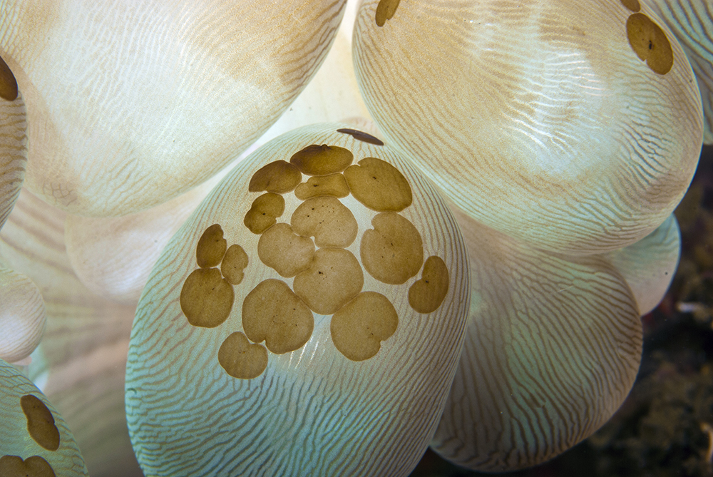 Another kind of strange parasitism is perpetrated by acoel flatworms against bubble coral colonies. Apparently not harmful, these animals most likely feed on organic detritus deposited on the host’s tissues. These small worms can duplicate themselves by a process called fragmentation, where little pieces of the worms can form other individuals. In this way, this kind of infection can be really huge and cover the host entirely.