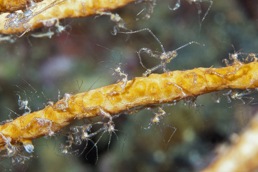 Crustaceans can infect many other animal groups, from gastropods to sea anemones, or even gorgonians. A typical example is the infection by huge colonies of caprellids. Recently, it has been discovered that a caprellid infection was the cause of high mortality of some species of gorgonians in the Bunaken National Park, in Indonesia. Caprellids act as predators of gorgonian polyps, and some intensive infections drive the coral colonies to a fast death.