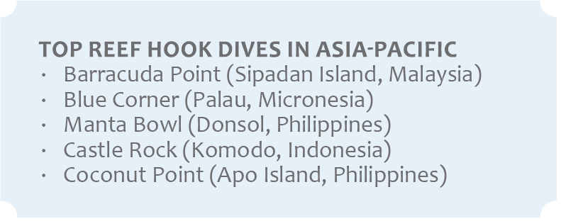 Reef hooks are a necessary tool for diving current- ridden destinations such as Sipadan in Malaysia, Komodo in Indonesia, Palau in Oceania, and Donsol in the Philippines. But if you’ve never used one before, deploying a reef hook in current-coddled conditions can be a bit challenging.