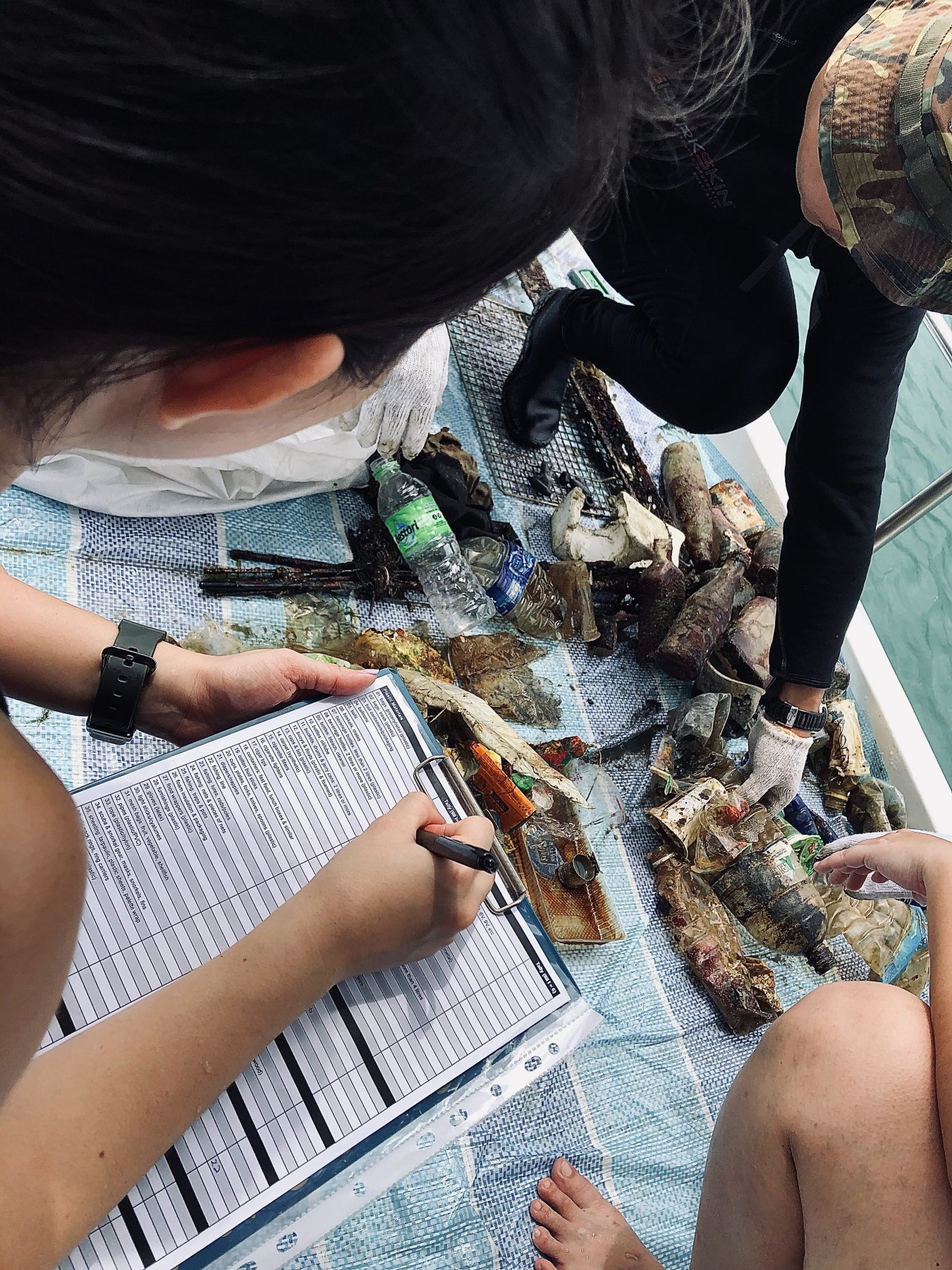 On deck, the team started sorting out the trash on the classic blue and white striped tarpaulin –  glass bottles, plastic bottles, fishing lines, fishing rods, and the likes. We were unsure of where the trash comes from. Perhaps the current brought them into our waters, perhaps those on their private yachts and at the coast took the ocean as a huge bin. As they carefully sorted, a team member recorded down each item retrieved. All this information is uploaded to Project AWARE’s website as part of their Dive Against Debris campaign, which provides valuable data to influence policy change. The top three debris types retrieved were plastic food wrappers (35), metal fishing equipment – sinkers, lures, hooks (22) and fishing lines (21) – quite a predictable mix.