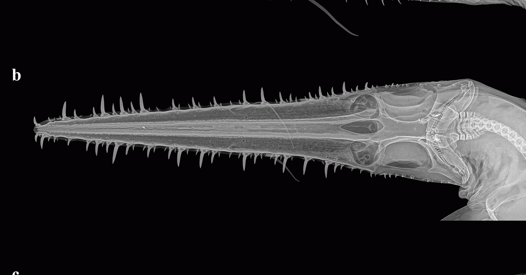 The new species are different from the previously known six-gill species, Pliotrema warreni, in the position of their barbels. In P. kajae and P. annae, the barbels are situated approximately halfway from the tip of the saw – the rostral tip – to the mouth, compared to P. warreni’s barbel which is closer to the mouth. The P. annae also has a characteristically shorter rostrum than its counterparts.