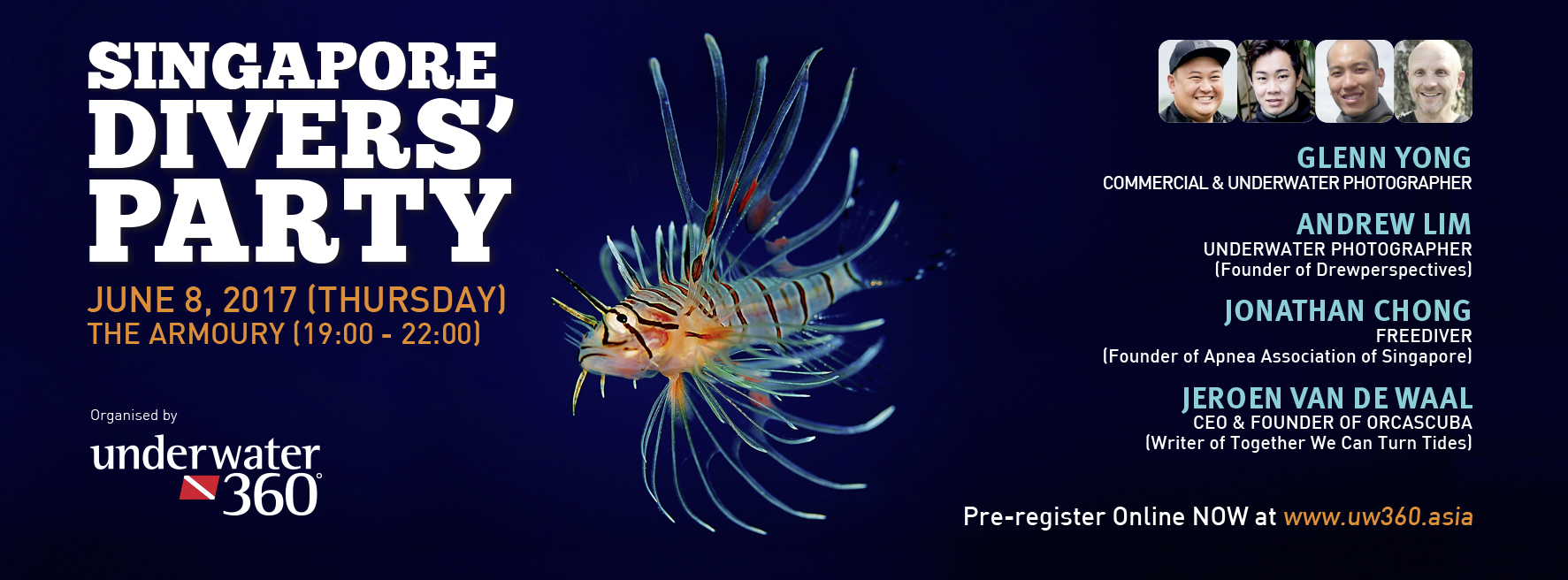 Speakers include: Jonathan Chong: A PADI Master Freediver Instructor, Jonathan formed the Apnea Association of Singapore, an organisation focusing and supporting the growth of freediving in Singapore. He’s also a competitive freediver and currently holds all six Singapore National records, four of which are currently South East Asian records. To Jonathan, freediving is more than just a sport – it is a gateway to understanding oneself and overcoming inner barriers. When not freediving, Jonathan can be found playing underwater hockey and underwater rugby. Glenn Yong: Having received a design education from a young age, he usually presents his visuals very much in a rather “minimalist” approach, defining only what is essential and critical to the needs of the user. Even till now, we see the minimalist design approach in his professional photography. Glenn has recently been accredited as a Master Photographer in the United Kingdom with the Master Photographer’sAssociation for his confidence and consistency in producing images of professional quality, and visuals of stunning details and colours. He is also a member of Weddings, Portrait Photographer International, WPPI ( United States), and has memberships with Canon Professional Services and Nikon Professional Services. Jeroen Van De Waal: Jeron is a PADI IDC Staff Instructor and the CEO and founder of Orca Scuba. He grew up in the east of the Netherlands – far away from the oceans. At an early age, he was intrigued and inspired by the expeditions of Jacques Cousteau and the crew of the Calypso. Life events took him away from his dreams and trapped him in the corporate career rat race. After having lived and worked on most continents over the past 25 years, he is now ready to put his life experience towards protecting the oceans and creating positive footprints. Andrew Lim: His first foray into serious photography began with arguably the most difficult form of the art – underwater photography. His love for nature and documenting wildlife in its element has been his greatest passion and honour at the same time. At age 21, Andrew published his first underwater photography book, Silhouette of Serenity, and donated part of the proceeds to charity. He was invited to meet the President of Singapore, Dr Tony Tan, in recognition for his work, and was also invited to speak on platforms such as TEDx. He has since founded Drewperspectives, a Singaporean-based underwater photography firm, and his work has been showcased by organisations such as River Safari Singapore, Silkair, and SKII. Alongside the talks, there are fabulous lucky draw prizes to be won from dive trips to dive gears – it’s a party you simply cannot afford to miss!
