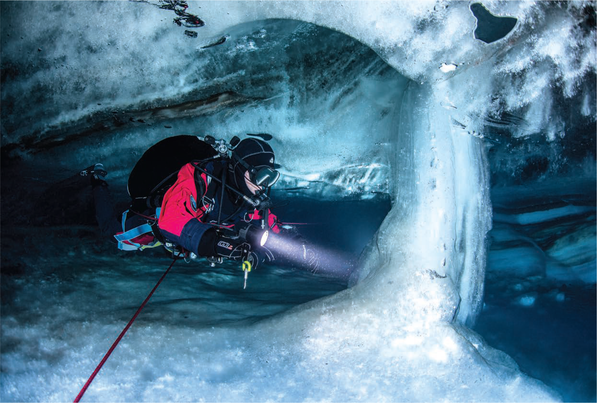 To perform the dive, we adopted the standard ice diving practice of having a surface team and an underwater team. A surface line connected to the first diver’s harness was used, which was looped through and tied to the second diver. This allows the divers to decide how much line to let out and the maximum distance between them. The line is also used as a tool for communication: The diver feeding the line can communicate with the surface team through a series of different tugs.