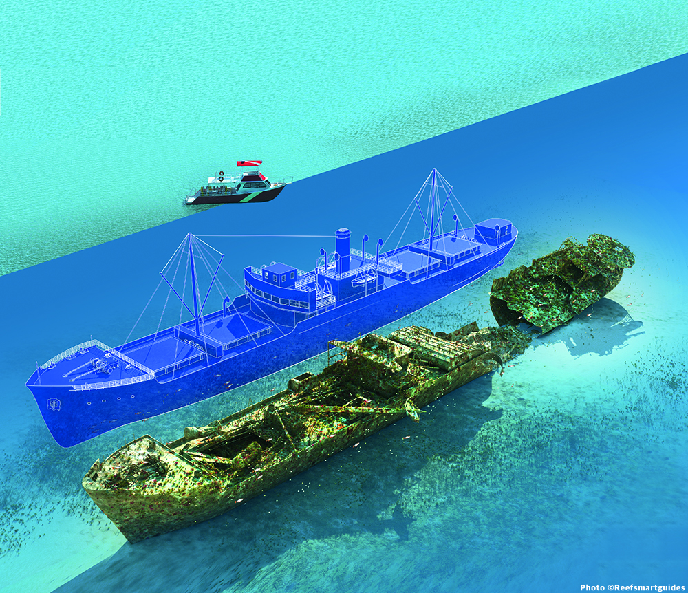 Resting in 15 metres of water, this Japanese seaplane sits upright on a large coral head. It was spotted from the surface in 1994, and now many artefacts can be found in and around the largely-intact seaplane, such as radios, ammunition and a small bomb inside the cockpit. The visibility is usually excellent, with octopus, nudibranchs and tropical reef fishes making it a photographer’s paradise.