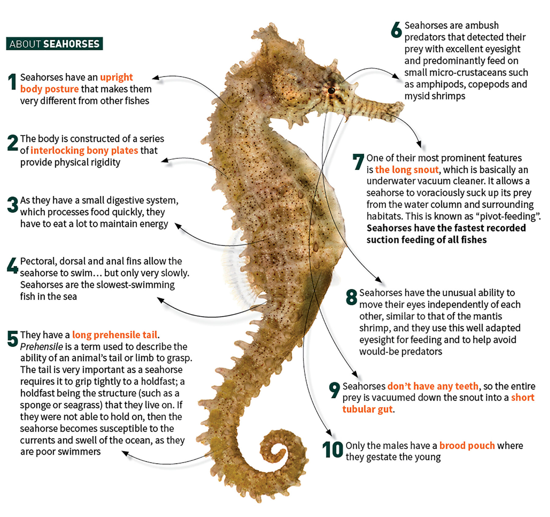 All seahorses belong to the one genus, Hippocampus, derived from the Greek: “hippo” meaning horse, and “kampos” meaning sea monster. So the head of a horse on the body of a sea monster – the term Hippocampus couldn’t describe a seahorse more perfectly!