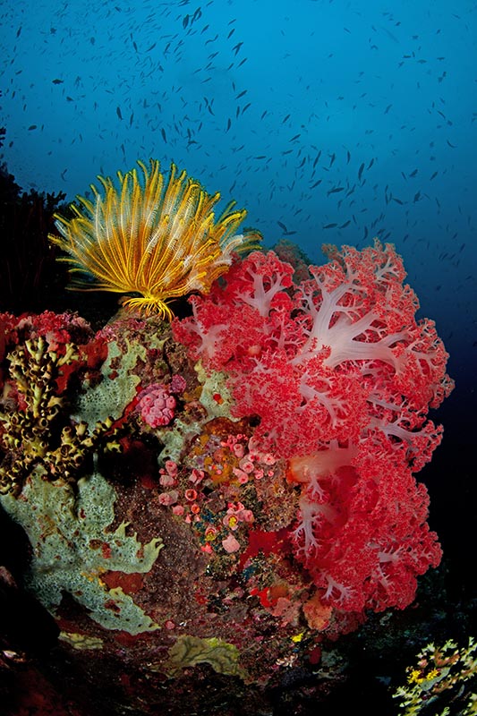 You know that you’ve reached another class of diving when you can’t even find one inch of barren reef to curl a finger around. Using a reef hook is often the best way to stay on the reef without decimating millions of years of ecological growth. Once latched on with a reef hook, take a moment to look around and pinpoint possible coral subjects. Since moving around the reef to strategically choose a coral subject is usually out of the question, the best subjects will often be the ones just a little shallower on the reef, allowing the photographer to shoot up and incorporate the heaps of glimmering baitfish and fusiliers shifting between the crevices and often blotting out the sun in the sky above.