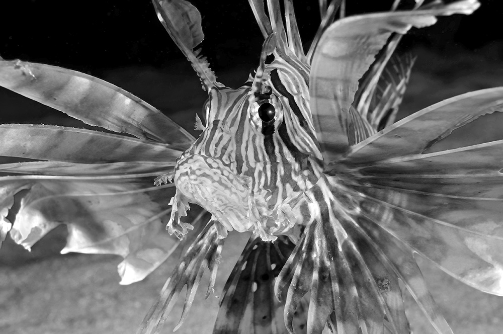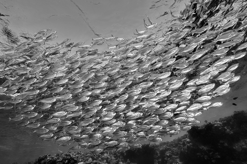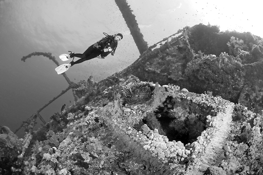 Refreshed in mind and spirit, we forge ahead with our second dive under the vessel. Almost as soon as I finish checking my gear to make sure everything is in order, I get the unnerving sensation that someone or something is watching me. I turn to the left just as a 2.5-metre oceanic, with 12 pilot fish in tow, swims past at a mere two metres away. There is no time to raise my housing for a shot. And, though the shark appears to be in no hurry, the deliberate, powerful strokes of its tail make it clear a chase would be futile.