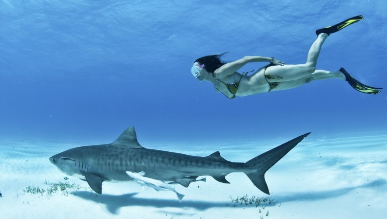 Last year, when I first swam with tiger sharks, I felt nervous before I got in. Put a tank on my back and throw me into shark-infested waters and I’m in heaven. I’d done a bit of free diving with blacktip and lemon sharks and learned that a mammoth camera housing between a mighty shark and me gives the feeling of a little protection, should the shark get too curious. But with no camera, no bubbles, and nothing but my bikini on, I did feel very vulnerable with the tigers.