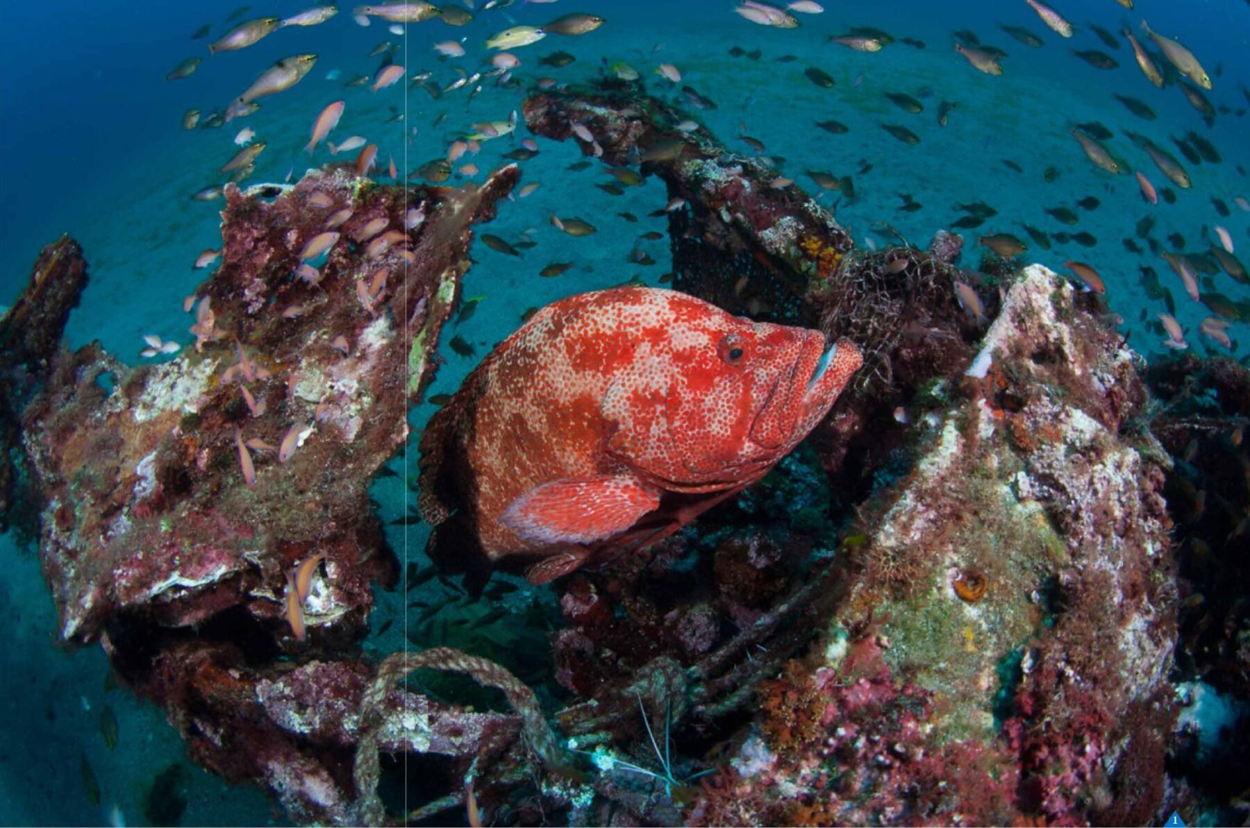 One of Yakushima’s most popular dive sites is “Zero-sen” in an area called Isso along the north coast, no more than five minutes by boat from the mainland. It’s the final resting place of a Mitsubishi A6M zero, a long-range fighter aircraft operated by the Japanese Imperial Navy from 1940–1945. Dropping into the water, the scene seems a little monotonous with a carpet of white sand that spreads out for miles. But then a dark cluster emerges, and, descending to about 20 metres, it soon becomes clear that this is the front part of the aircraft, a safe haven for the many small fish species that dart out of harm’s way as divers approach. There are also huge numbers of sponges, from barrel sponges to the encrusting varieties, and a couple of territorial moray eels that curiously poke their heads out from within the wreckage. Communities of slender sweepers and black spot cardinalfish share their home with white socks shrimps and some ever-present cleaner shrimps.